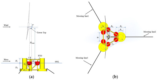 Diagram of the hybrid system consisting of an OC4-DeepCwind semi-submersible platform and multiple heaving WECs: (a) Side view; (b) Top view.