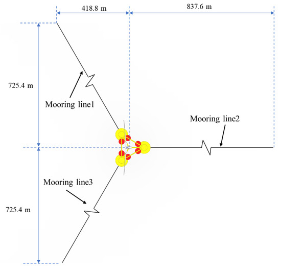 A three-catenary mooring system is assorted to the platform (Figure 2). The property and arrangement of the mooring lines can be referred to in Ref. [32]. The mooring system is converted to an equivalent stiffness matrix (Table 2) by the open-source code Mooring Analysis Program (MAP) [33] for the coming frequency-domain analysis.