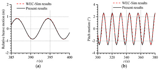 Comparison of the relative heave motion between WEC and spar and pitch motion between the present results and the published numerical results using WEC−Sim code: (a) Relative heave motion (bpto = 1200.0 kN·s/m, T = 8.0 s); (b) Pitch motion (bpto = 0.0 kN·s/m, T = 12.0 s).