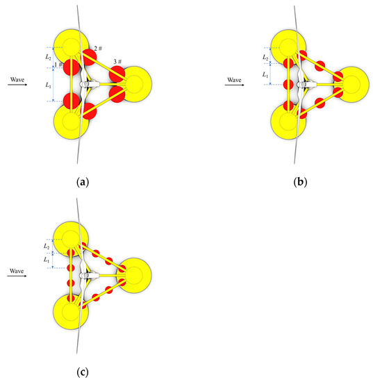 Configuration of WECs is of vital importance for the performance optimization of the hybrid system. The influence of the distance L3 of WECs protruding out the sides of the triangular frame of the platform on power performance and motion response of the hybrid system is explored, given in Figure 9. A hemispherical bottom-shaped WEC with 2r/d = 3.0 is chosen to be studied in an operational sea state.