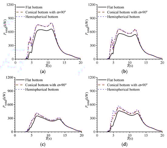 Power performance is the key index to test whether the hybrid system integrates well. Total wave power Ptotal versus incident wave periods for WECs with different bottom shapes are compared in Figure 5. For the same 2r/d, the performance of wave power for WEC with the hemispherical bottom is almost as good (Figure 5a,b,d) or slightly better (Figure 5c) as that with the conical bottom. The total wave power of both these two is larger than that of WEC, with a flat bottom in all incident waves for various values of 2r/d. Specifically, the annual wave power of WEC with a 90° conical bottom and with a hemispherical bottom increases by 32.5%/35.1%, 26.0%/29.1%, 27.2%/43.0%, and 24.7%/29.2% compared with cylindrical WEC with the flat bottom when 2r/d = 3.0, 2.5, 1.5, and 1.0, respectively. It is consistent with Zhou et al.’s discovery [29] that the single WEC with hemispherical bottom has the best energy conversion performance without being combined on the wind platform.