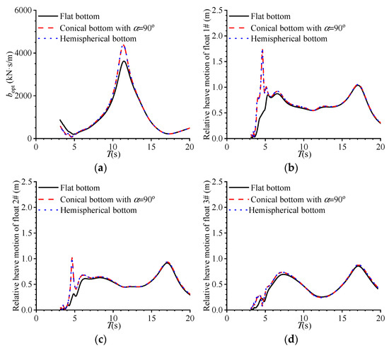 The optimal PTO damping and relative heave motion versus incident wave period of WECs with different bottom shapes in the case of 2r/d = 3.0: (a) bopt; (b) Float 1#; (c) Float 2#; (d) Float 2#.
