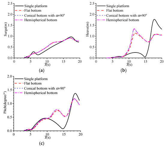 In Figure 7a, compared to the surge motion of a single platform, the platform combined with various bottom-shaped WECs manifests little increase or decrease in different wave period ranges. Bottom shapes hardly affect the surge motion of the platform.