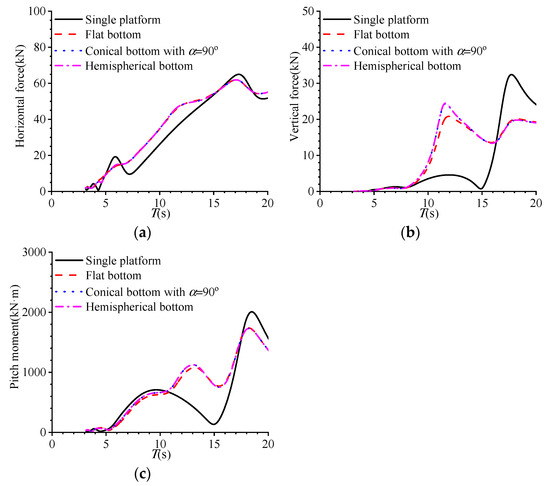 In Figure 8a, compared to the horizontal force of a single platform, the platform combined with various bottom-shaped WECs manifests little increase or decrease in different wave period ranges. Bottom shapes hardly affect the horizontal force of the platform. In Figure 8b, working near the resonance period in the heave direction (i.e., Theave = 17.5 s) of the platform, the vertical force of the hybrid system is reduced compared to a single platform. Whereas, in the range of 8.0 s–16.0 s, the vertical forces of all three with different bottom shapes are much larger than that with a single platform. The vertical force of the hybrid system with WECs with 90° conical and hemispherical bottoms is slightly larger than that with conical bottoms. In the rest waves (3.0 s–7.0 s), there is little difference in vertical force between the hybrid system with three different bottom-shaped WECs and a single platform. In Figure 8c, in the range of 3.0 s–10.0 s, the hybrid system fluctuates slightly in pitch moment. In the range of 10.0 s–17.0 s, the pitch moment of the hybrid system with WECs with 90° conical and hemispherical bottoms is larger than that with conical bottoms. The pitch moments of all three with different bottom shapes are much larger than that with a single platform. In the range of 17.0 s–20.0 s, the pitch motion of the hybrid system is reduced compared to a single platform.