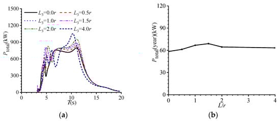 In Figure 10a, near the resonance period (T = 5.18 s) of the target sea, the wave period corresponding to the peak value of total wave power shifts towards a larger period. As the distance between WECs and the platform increases, the offset amplitude and the peak value of total wave power gradually become larger. Till L3 = 4.0r, the peak value decomposes into several smaller peaks. Near T = 12.0 s, the wave period corresponding to the peak value begins to move towards a smaller period gradually. This peak value becomes larger with the increase in distance.