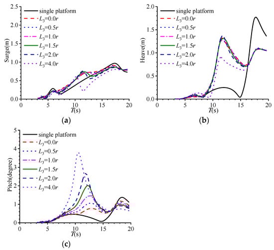 Figure 11 gives the surge, heave, and pitch motion of the OC4 platform for various distances L3 with a single platform for comparison. In Figure 11a, as the distance between WEC and the sides of the platform increases, the surge motion of the platform in the range of 10.0 s–14.0 s decreases, with little difference in other ranges of wave period. In Figure 11b, except for L3 = 4.0r, the peak value and its corresponding wave period of the heave motion of the hybrid system are seldom affected by the distance L3. In Figure 11c, as distance L3 increases, the peak value of pitch motion increases in the range of 8.0 s–14.0 s, and this value decreases in the range of 17.0 s–20.0 s. Meanwhile, in the range of 8.0 s–14.0 s, the wave period corresponding to the peak of pitch shifts forward to a smaller one.
