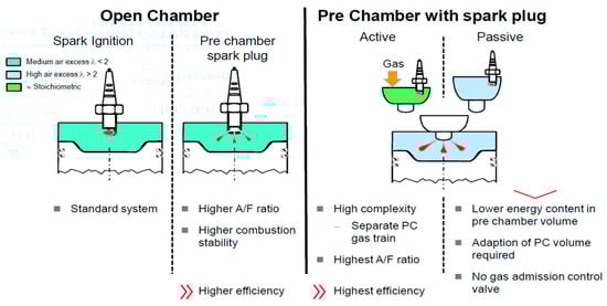 The second option includes a prechamber in addition to the main combustion chamber (right side of Figure 1), and is typically used in engines with power ratings greater than 2 MW (larger pistons, larger diameter, requires stronger torches). The spark plug is placed in the prechamber and the prechamber may be active, i.e., a chamber into which gas is injected, or it may be passive, i.e., without injection, in which case the same mixture present in the combustion chamber is introduced into the prechamber [10,11]. In the first case, pure gas is introduced into the prechamber so that when the spark is generated, the inside of the prechamber contains an AFR close to the stoichiometric AFR. This generates very-high-energy torches that penetrate the main combustion chamber and are capable of igniting very lean mixtures of AFR > 2 efficiently [12].