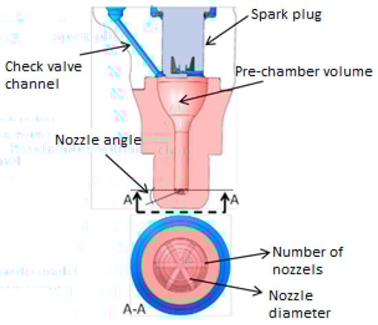 The loss of efficiency and stability must be counteracted by increased turbulence through modifying the design of the main parts involved in the combustion process (piston, cylinder head, spark plug, combustion cycle, etc.) [16], including the prechamber itself, the design of which plays a significant role in combustion efficiency. The main design parameters of a pre-combustion chamber are described below with the help of the schematic representation in Figure 3 [19].