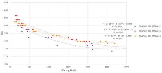 All results are displayed in “engine map” mode and combustion conditions range from lean (high AFR, low NOx emissions) to rich mixtures (low AFR, high NOx emissions, with a maximum limit of 2000 mg/Nm3), using “misfire” as the lean mixture upper limit and “knocking” as the rich mixture upper limit. The variables are represented in terms of mg NOx/Nm3 (normal cubic metres refer to exhaust gas flow), which is common practice in the industry, since it provides the user with direct information about the NOx emissions associated with the engine characteristics.