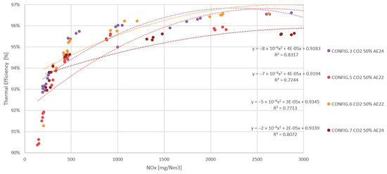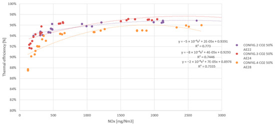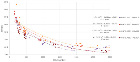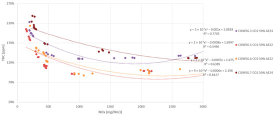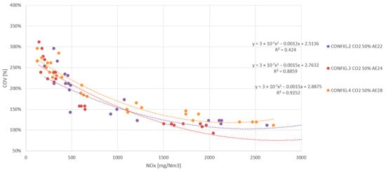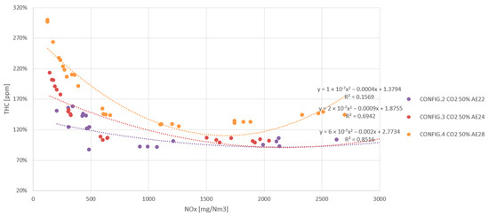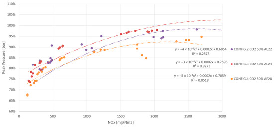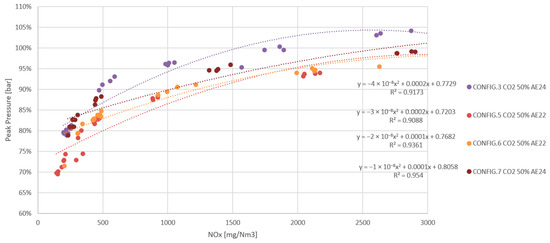 All results shown are arithmetic averages of four 30 s measurements, taken at the same stationary operating point and leaving 60 s between them, which is equivalent to a total sampling time of 5 min. During this time, the PUMA Open system acquires the values of each sample and each peripheral device according to the frequency set in the software. The result is an average of all values recorded in that time interval. The results were plotted and are presented below in the order in which the experiment was carried out. The values are represented as a percentage of reference data, which in this case are the data for the G-86EM multi-cylinder engine running on LNG at an emission level set at 500 mg NOx/Nm3.