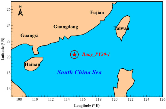 ERA5 is the fifth-generation and most recent meteorological dataset provided by the European Centre for Medium-Range Weather Forecasts (ECMWF). This dataset contains a large number of meteorological elements, including wind speed, wind direction, pressure, temperature, humidity, etc. ERA5 is the predecessor of the ERA-Interim global atmospheric reanalysis data and has higher spatial and temporal resolution than that product [28]. There are many methods for studying wave energy resources. One of which is to use meteorological data to analyze marine atmospheric environmental conditions to estimate wave energy resources, and the wave field data from ERA5 is used in this study. The time range considered by this study is from January 2012 to December 2021 and contains hourly observations. The spatial range is 15–27° N, 107–126° E, and the spatial resolution is 0.125° × 0.125°. When analyzing wave energy resources in a specific sea area, the accuracy of the selected data will directly affect the accuracy of the resource assessment results. Therefore, the buoy selected for this study to verify the accuracy of the significant wave height and energy period ( provided by ERA5 is the directional Wave Rider MkIII buoy (Datawell BV, Haarlem, The Netherlands). The buoy, Buoy_PY30-1, was deployed by the State Oceanic Administration of China in the offshore area of the South China Sea during the Ocean Renewable Energy Special Fund Project (GHME). The buoy was located at 20.2447° N and 114.9413° E. The buoy data period used in this study was from April to June 2012, with an interval of one hour. The buoy position is shown in Figure 2.
