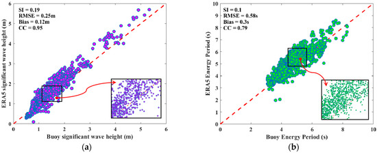 Section 2.1.1 introduced the basic information of ERA5, the buoy, and the four parameters used to verify the accuracy of the ERA5 data, namely, SI, RMSE, bias, and CC. The values of SI, RMSE, and bias indicate the degree of difference between the ERA5 and buoy data, while the CC values indicate the degree of correlation between the ERA5 and buoy data. In this section, ERA5 data are compared with buoy data, and the above four parameters are calculated. The comparison results are shown in Figure 4.The results show that the SI, RMSE, and bias values of compared with the buoy are 0.19, 0.25 m, and 0.12 m, respectively, which indicates that the difference between the ERA5 data and the buoy is small. The value of the correlation coefficient CC is 0.95, which also indicates that the parameter has a strong correlation with the buoy. The values of SI, RMSE, bias, and CC of compared with the buoy are 0.1, 0.58 s, 0.3 s, and 0.79, respectively, which also shows that the ERA5 data are relatively accurate and have little difference from the buoy data.