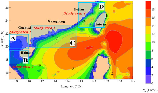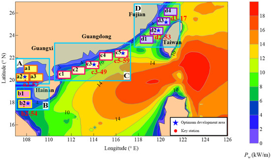 Considering the exploitable level of wave energy resources in the three small study sites shown in Table 4, small study site a2 is selected as the dominant development area in Guangxi Province. The division method for areas B, C, and D is the same as that for area A. It is calculated that area b2 within the Hainan Province area is the most valuable location for development in area B. As the offshore extents of areas C and D are relatively wide, two small optimum development areas are selected in these two larger areas. After calculation, study sites c3 and c5 within area C of Guangdong Province are identified as the optimum development areas. In area D, at the intersection of Fujian and Taiwan Provinces, d2 and d3 are identified as the optimum development areas.