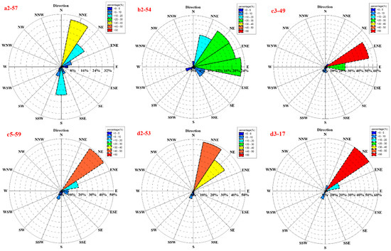 Figure 9 and Table 5 show that the coastal area of Guangxi has a monsoon climate. Under the influence of the northeast monsoon, the dominant directions of wave energy propagation are NNE and NE at a2-57, which is a key station off the coast of Guangxi. Under the influence of the south wind, part of the wave energy propagates in the south direction. The power on the main wave side of the station in the full sea state accounts for 71% of the total power during the full sea state. Under storm protection, the upward power of the main wave accounts for 72% of the total power in the overall direction. At b2-54, a key station off the coast of Hainan Province, NNE-E is the dominant wind direction for wave energy propagation. The area is mainly affected by the northwest monsoon in winter, and the dominant direction starts to move eastward. The power on the dominant wave side of this station in the full sea state accounts for 77.4% of the total power of the full sea state. The power of the dominant wave side under storm protection accounts for 77.8% of the total power under the full sea state. At c3-49, a key station off the coast of Guangdong Province, the dominant direction that wave energy propagates is ENE and east due to the influence of the northeast monsoon. The power on the dominant wave side of the station in the full sea state is approximately 74.2% of the total power of the full sea state. In the storm protection mode, the power from the dominant wave side accounts for 75.7% of the total power from all directions. At key station c5-59 in the c5 area, the dominant wave direction is consistent with the NE wind direction for the whole sea state, and the power of the dominant waves of the whole sea state accounts for approximately 60.7% of the total power of the whole sea state. The dominant wave direction under storm protection is from NE to ENE, and the power ratio, in this case, is 66.4%.