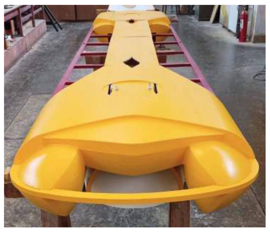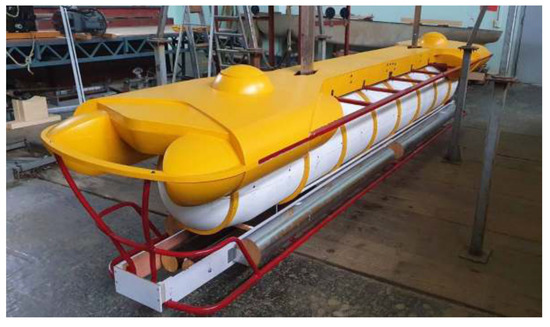The model was, therefore, produced of various materials, at a scale of 1:5.0. The hull was constructed from GRP, cover parts from plywood and obeche wood, and the exostructure consisted of metal parts. The battery pods were produced from tin, and the variable ballast tanks were made from plastic. Photographs of the model are presented in Figure 1, Figure 2 and Figure 3.