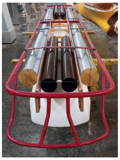 Additionally, there is certainly a strong interaction between the cylindrical parts in the bottom portion of the submarine’s body and the exostructure elements of the cylindrical cross-section and the other parts of the submarine’s body. This may lead to certain flow instabilities and affect the measurement results, and at the same time it is a challenge for the numerical calculation as well, in the first place regarding the choice of an appropriate turbulence model. Consequently, deviations in the results are almost inevitable. Altogether eight cylinders are in the bottom part of the submarine. Four of them (outer ones) represent battery pods and the other four (inner ones) represent variable ballast tanks (Figure 2). Their fineness ratio, L/D, is above 10 and the gap between the inner cylinders is about 0.3 Di (Di is the diameter of the inner cylinders), while the gap between the inner and outer cylinders is 0.3 DO (DO is the diameter of the outer cylinder). Furthermore, in the axial direction there are two cylinders located (i.e., a gap in between two different segments is present). In addition to the cylinders, there are also supporting structures which induce even more complexity to the flow (rectangularly shaped). The maximal local Reynolds number of a cylinder at the model scale was 2.5 × 105, for the larger cylinder at a speed of 5.5 kn. In all other conditions, the local Reynolds numbers were smaller. Axial flow over such a structure, including the creation of a boundary layer of each component and local values of Reynolds numbers, is expected to be complex and to include interactions of components. These interactions can also be seen from the CFD results of streamlines around the submarine, presented in Figure 15 in ref. [15].