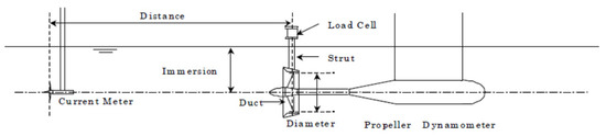 During the test, the propeller model was attached to a horizontal shaft. The draught of the shaft’s centre line was one and a half diameters below the water’s surface to avoid air drawing from the water’s surface. The dimensions of the tank were such that any blockage was avoided. The experimental set-up is schematically shown in Figure 8.
