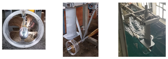The nozzle was supported by a strut which had a streamlined section shape. During the test, only the thrust of the nozzle was measured. The nozzle thrust was measured by a load cell placed inside a shielded strut. Photographs of the propeller in the nozzle, the equipment setting, and the open water tests are shown in Figure 9.