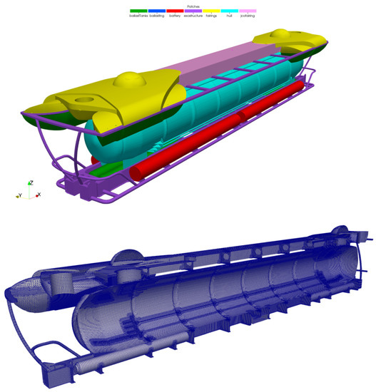 The geometry of the pressure hull and exostructure used in the CFD simulation (top). Sliced view of the discretised surface geometry of the submarine (bottom) [15].