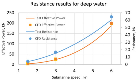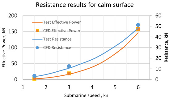 The resistance and effective power for the submarine in calm surface conditions are presented in Figure 12. The lines show the results obtained by the tests, while the three points available from CFD analysis are shown as dots. The test resistance results for 5.5 kn and 6 kn are obtained by extrapolating from lower speeds, as explained in Section 2.2.