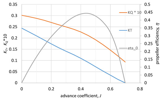The results of the analysis are presented in the form of a diagram, where the abscissa represents the advance coefficient (Equation (11)), while on the ordinate are plotted simultaneously the torque coefficient , the thrust coefficient , and the propeller efficiency , given as