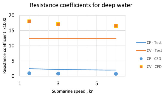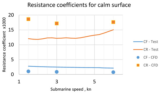 It may be noticed in both figures that friction resistance is a minor part of the total resistance coefficient. This is a consequence of the perpendicularly placed exostructure elements that may be noticed in Figure 1, Figure 2, Figure 3, Figure 4 and Figure 5. These elements cause flow separation and re-circulation, reducing the amount of shear flow close to the submarine’s surfaces. The occurrence of this phenomenon can be seen from the CFD results of streamlines around the submarine when sailing at 3 knots speed at 40 m depth, presented in Figure 15 in ref. [15].