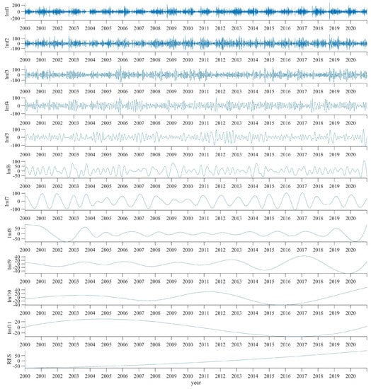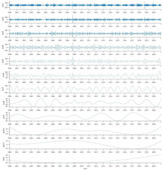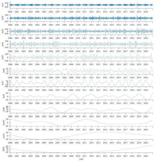 where represents the original sequence; denotes the variation sequence with different amplitudes and frequencies, i.e., intrinsic mode functions (IMFs); meanwhile, is the residual term of the original signal after removing all signals [39].