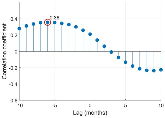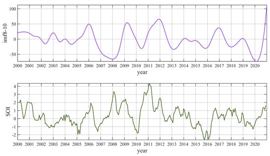 Sea-level changes are influenced by a multitude of factors, such as land subsidence, reclamation, and global climate change. Among these, the impact of global climate change on sea level is both long term and periodic, which is also manifested in the study area. Furthermore, the study area is located in the western Pacific and is therefore significantly affected by ENSO, which exhibits quasi-periodicity with a cycle of 2–7 years [18,34,77,78]. To more explicitly analyze this influence, the IMF8, IMF9, and IMF10 components corresponding to the period of QUB are superimposed and reconstructed, and subsequently denoted as IMF8-10. It is compared with the contemporaneous SOI (Figure 6). The SOI reflects the activity of the El Niño phenomenon. A continuous negative SOI indicates the occurrence of an El Niño event, whereas a positive value signifies a La Niña event. Time-lead lag correlation analysis reveals that the highest correlation between the IMF8-10 signal and the SOI index is 0.36 (with a sea-level delay of 6 months), indicating a response time delay of 6 months between the signal delay and the El Niño, which is higher than the original correlation coefficient of 0.15 between the signal and the SOI (Figure 7). This result demonstrates that ENSO exerts a certain influence on sea-level changes in the study area. The impact of the ENSO phenomenon on sea-level anomalies in the northern coastal waters of the SCS can be succinctly summarized as follows: ENSO initially induces trade wind anomalies. In the case of negative anomalies, southward wind field anomalies are observed, prompting the generation of westward currents due to the wind-driven current mechanism. This, in turn, leads to volume transport between the SCS and adjacent oceans, as well as anomalous Ekman pumping, ultimately resulting in elevated sea levels in areas of seawater convergence. Conversely, positive anomalies produce the opposite effect. In essence, during El Niño periods, the sea-level height in the northern SCS decreases, while it exhibits an upward trend during La Niña periods. Furthermore, mass exchange, predominantly governed by precipitation, plays a more critical role in the persistence of negative sea-level anomalies in subsequent periods [18,33,79].