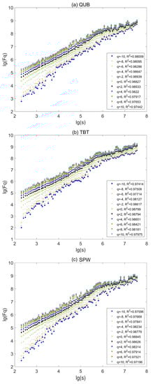 Figure 8 presents the relationships as a function of for the sea-level time series measured by the QUB, TBT, and SPW tidal stations. The horizontal axis represents the sub-segment length of the time series, and the vertical axis represents the logarithm of the corresponding values, where is the -th order function of the time series with a sub-segment length of s. When the time series exhibits multifractal characteristics, the curve assumes an approximate linear relationship, with the linear slope representing the Hurst index of the time series. From top to bottom, the curves in the figure correspond to . It can be observed that for different values of q, the curves corresponding to each tidal station exhibit a distinct linear trend. Through calculation, their corresponding R2 values are all greater than 0.9, and the fitted lines satisfy statistical tests. This demonstrates that the sea-level time series of the three tidal stations possess multifractal characteristics, i.e., long-range correlations over multiple scales, indicating that the time series exhibit similar statistical patterns at different time scales.