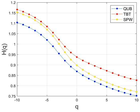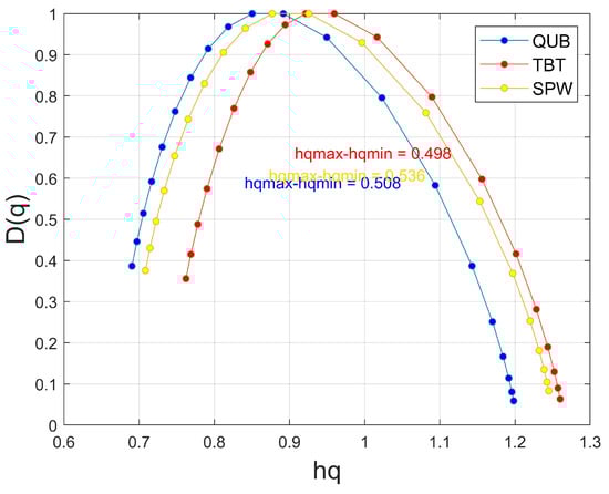 Subsequently, through the MF-DFA analysis, the generalized Hurst exponent plots (), mass exponent plots (), and multifractal spectra () corresponding to the three tidal stations were obtained, as illustrated in Figure 9, Figure 10 and Figure 11, respectively. is the generalized definition of the -th order Hurst exponent, which reflects the long-term dependence and self-similarity of data on different time scales. In Figure 9, the horizontal axis represents the values, and the vertical axis represents the corresponding values, that is, the -th order Hurst exponent. From the figure, the relationship between for all three stations is nonlinear, and when , the corresponding for QUB, TBT, and SPW are 0.83, 0.91, and 0.86, respectively, all greater than 0.5, indicating that all of the time series possess multifractal characteristics and long-range correlations.