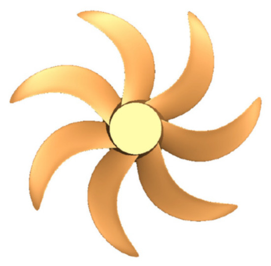 The E1619 propeller is a seven-bladed highly skewed propeller. The main parameters are shown in Table 2. For open-water calculation, the diameter of the E1619 propeller is taken as 0.485 m. The E1619 propeller model shown in Figure 1 is applied. For self-propulsion calculation, the E1619 propeller diameter is 0.262 m, and the length of AFF8 model is 4.356 m referring to Sezen’s self-propulsion calculation configuration (Sezen [19]). The DARPA Suboff AFF8 submarine model with its propeller, as shown in Figure 2, is used.