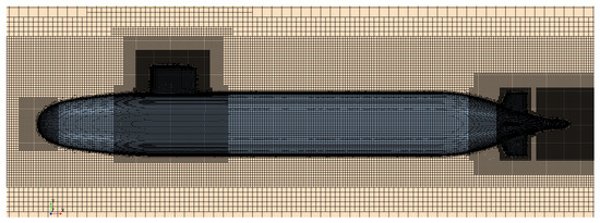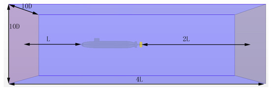 The computational domain is cuboidal. The lengths of the two short sides of the outer domain are specified as 10Dmax, and that of long sides is 4LOA. The inflow boundary is 1LOA from the foremost edge of the submarine, and the outflow boundary is 2LOA from its aft. In addition to the inflow and outflow boundaries, the other four edge interfaces are set as symmetrical faces.