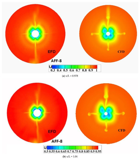 Contours of axial velocity distribution of submarines at different cross sections (dimensionless velocity component is x-axis direction).
