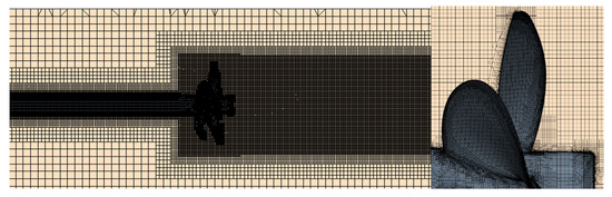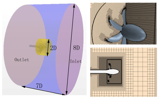 Referring to Figure 6, the calculation domain of the open-water propeller is cylindrical with a diameter of 8D. The inflow boundary is set to 3D in front of the propeller disc and the outflow boundary is set to 4D behind it. To obtain the flow field around the propeller, the propeller is placed in a small cylinder with a diameter of 2D. Thus, the computational domain is divided into two parts: the rotating region that includes the propeller and the static outside region. The interface between static and rotating regions is set for data transmission and communication. The mesh of the rotating and calculation regions near the propeller is densified. The structured grid is used to divide the mesh and the mesh near the propeller area is encrypted layer-by-layer. The total number of grids is about three million. The mesh quality is shown to be topologically efficient without negative volume elements.