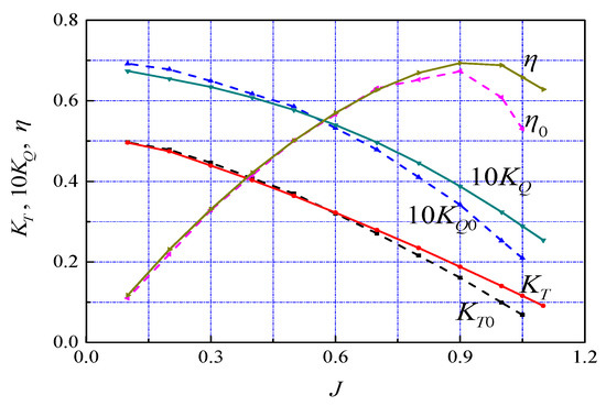 Because the open-water inflow is steady and uniform, a multiple reference frame algorithm can be used for steady calculation and to save time. The obtained open-water curve is shown in Figure 7. J represents the advance coefficient; KT0, KQ0, and η0 represent the experimental values of thrust coefficient, torque coefficient, and propeller efficiency, respectively; and KT, KQ, and η represent their calculated values, respectively.