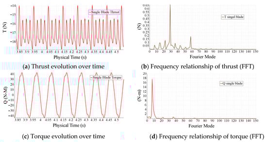 Referencing the self-propulsion factor solution (ITTC [24]), the mesh-setting of the calculation is basically the same as that of the bare-hull resistance calculation, except that it is applied to the propeller area. To calculate the area division, please refer to the previous description of resistance calculation and Figure 8. For calculation, the thrust identification method is used. According to the values of thrust and torque obtained from the self-propulsion analysis, their coefficients are calculated. To obtain the propulsion coefficient of the submarine self-propulsion approach point, the thrust coefficient is input into the open-water curve, and the corresponding coefficient is obtained. Here, both the open-water curve obtained by experiments and numerical simulation can be used to calculate the propulsion coefficient of the self-propulsion point. In order to compare with the result of Sezen et al. [19], the inflow speed is set to 3.051 m/s. Thus, when the self-propulsion point is reached, the rotation speed, n, of the propeller is 10.20 rps. The output thrust (T) and torque (Q) change periodically over time. Figure 9a,c shows the converging thrust and torque pulsations of a single blade, respectively. After applying the fast Fourier transform (FFT), the relationship between pulsation amplitude and frequency of a single blade is obtained, as shown in Figure 9b,d. After the Fourier transform, there are circumferential components independent of the blade and shaft frequencies as given in Figure 9b,d, which are attributed to the forward hull interference. The presence of appendages leads to the inflow non-uniformity and instability of the propeller.