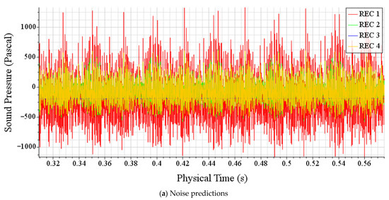 For the E1619 propeller and its open-water performance prediction, a transient calculation is carried out. The area containing the propeller is regarded as the noise source, and several hydrophone receiver positions are defined. In the calculation, the time step is adjusted according to speed. Differing from the hydrodynamic calculation, the rotation angle at each time step changes from 1 to 0.1°, and the specific time step is 2.31 × 10−5 s. Other settings include the general configuration of sound velocity in water and that of the hydrophone positions, which must be adjusted according to the different model characteristics.