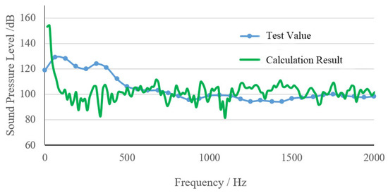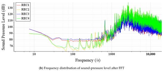 (3) The sound-pressure data of hydrophones are extracted, and the sound-pressure level is determined. Then, a Fourier transform is performed to convert the time-domain signal into one of the frequency domain. The sound-pressure spectrum level is measured in the Hz bandwidth, and the frequency resolution is 1 Hz.