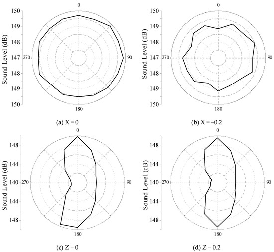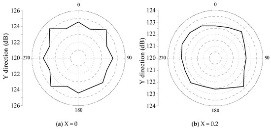 To investigate the propagation characteristics of the radiated noise when the submarine is sailing, the projection of the central position of the local coordinate system is regarded as the center of the circle, and multiple hydrophones are evenly distributed at different sections so that each section has sixteen hydrophones. After calculating the total sound pressure, the directivity map of sound pressure is drawn, as shown in Figure 18.