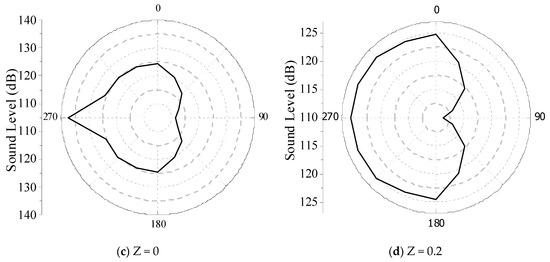 Figure 18 shows the law of noise propagation and attenuation under the self-propulsion condition. Figure 18a,b shows the directivity curve of the plane parallel to the propeller disc. In these figures, unlike the propeller, the noise pattern of the submarine under self-propulsion is no longer consistent along the circumferential direction, which is more angular than that of the pure propeller. This is mainly influenced by the appendages. The axial attenuation of noise can be seen by comparing the noise of the two images. Figure 18c,d shows the directivity curve of the plane perpendicular to the propeller disc. Referring to Figure 18c,d, the sound direction is quite different from that of the pure propeller. The noise level of the hydrophone at the downstream position of the propeller still conforms to the situation for which the thickness noise accounts for the main part when the pure E1619 propeller is used, as in Section 4.1. However, the noise level at the upstream of the propeller increases significantly, which can be attributed to the submarine hull being directly connected to the upstream propeller. Compared with Figure 18c,d, even if the hydrophone position is separated from the hull, the radiation noise propagation remains affected by the hull, and the upstream noise is amplified. The radiation noise decays along the propeller radial and axial direction. Furthermore, the upstream noise radial decaying speed is faster.