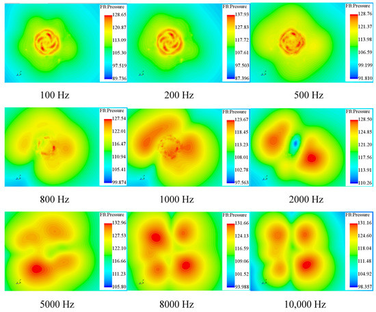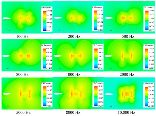 Figure 19 and Figure 20 show the sound-pressure distribution at different cross sections. At different frequencies, the overall distribution of sound pressure changes, and the difference between high and low frequencies is obvious. In Figure 19, the main contribution of low-frequency noise is the monopole, and there is no clear direction for its development. However, it reflects the characteristics of the quadrupole of the four high-pressure areas distributed at the noise source (propeller) area. When the frequency is greater than 500 Hz, the noise contribution of the quadrupole becomes more evident, and the development trend of the sound field becomes that of the quadrupole extending outwards. The quadrupole term gradually becomes the main contribution to total noise. Figure 20 shows that from the longitudinal section, there are two high-pressure areas near the propeller, and the noise-pressure field develops outwards with these two poles at the center, reflecting dipole characteristics. When the frequency is very high (over 8000 Hz), the development trend of the sound field is also gradually transferred to the quadrupole. Referring to Lighthill [5] and FW–H final form, the total noise can be divided into expressions of monopole, dipole and quadrupole terms. Regarding the flow on the rotating wall, the speed of rotation is small relative to the speed of sound propagation in water, and the monopole and dipole terms are usually the main contributions to noise. Thus, the influence of quadrupole is usually ignored. However, the two figures show that for cases of high frequency, the quadrupole term in the FW–H equation is no longer negligible.