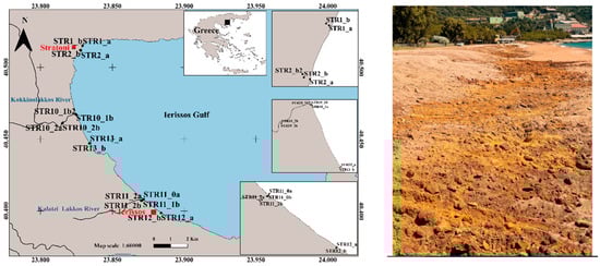 The study areas (the Stratoni and Ierissos beaches) are situated in the Ierissos Gulf in the Chalkidiki Peninsula in northern Greece (Figure 1). A description of the study area’s characteristics is included in the details elsewhere [9,11]. Briefly, the city of Stratoni is located at the north part of the Ierissos Gulf, where a polymetallic mine is located. In this mine, the primary minerals (pyrite (FeS2), sphalerite/zinc blende (ZnS) and galena (PbS)), and the secondary ones (arsenopyrite (FeAsS), rhodochrosite (MnCO3), chalcopyrite (CuFeS2), bornite (Cu5FeS4) and magnetite) [16] were exploited from ancient years until the present day. At the Ierissos gulf, rivers and streams also discharge mining residuals due to the floatation plant operation. The city of Stratoni is also located at the load out pier area of the mine. On the other hand, Ierissos is situated in the southern part of Stratoni, and it mainly hosts tourist activities. A detailed description of the study areas can be found in the literature [9,11].