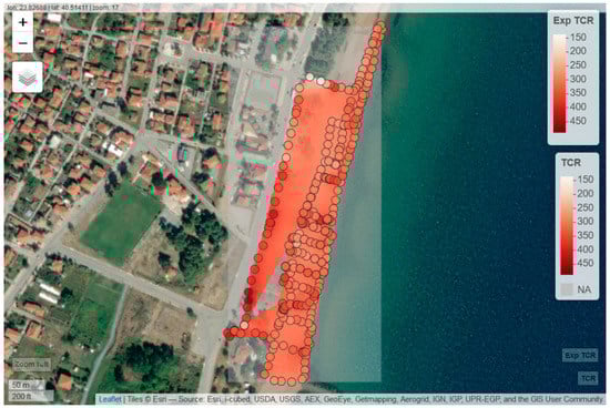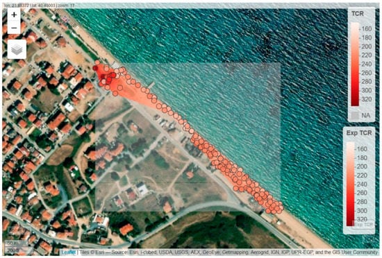 The map of the total counting rate (TCR), the data interpolation, and the experimental data are depicted in Figure 4 for the beach area of Ierissos.
