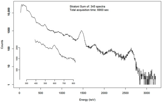 The total spectrum as acquired during the entire campaign is depicted in Figure 5, and was produced in an automated manner by the software code. In qualitative terms, the spectrum mainly contains the typical NORMs, such as the progenies of 238U (214Pb and 214Bi), as well as the progenies of 232Th (228Ac and 208Tl). As in the previous area of study, the contribution of 40K (at 1461 keV) was also observed, taking into account that in this photopeak energy area there is also a contribution from several energy peaks of 214Bi [21,27]. In the Ierissos beach area, the contribution of NORMs (e.g., 214Bi) in terms of activity concentration is reduced compared to the Stratoni beach area. The spectrum was also analysed for 137Cs using the SPECTRW software package [27]. Similarly to the previous spectrum for Stratoni beach, sum peaks at high gamma-ray energies are recorded into the spectrum which are not considered for further quantitative analysis.