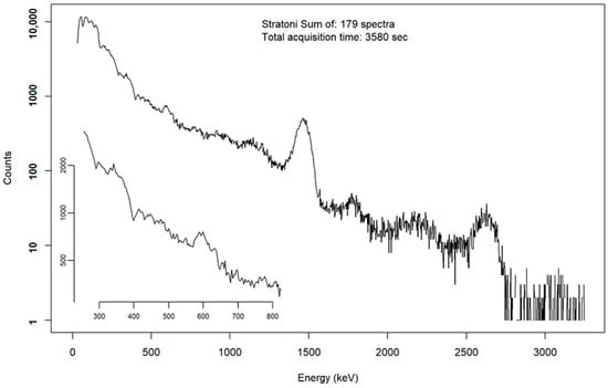 The map of the total counting rate (TCR) using data interpolation methods is provided for the Stratoni beach area in Figure 2. The total counting rate varied from 150 to 510 counts per second in the entire area. A total of 345 spectra were acquired during the experiment, and the live time of all measurements was 6900 s. In Figure 2, the interpolation data are classified with different colors, while the experimental data are depicted with colored circles in order to show the experimental data via the interpolation process. The areas exhibit the highest values in an area where a dynamic system discharges material at the west part of the beach. On either side of the berm zone, we observed various unearthed foreign sediment types, which we identified as the likely by-products of mining activities. Environmental remediation activities (i.e., excavation and top-soil removal) were underway throughout our data collection program. The total spectrum as acquired during the whole campaign is depicted in Figure 3, and is given automatically from the developed software using the R code [25]. We consider the total spectrum in order to determine the activity concentrations of NORMs and 137Cs, since the statistics are adequate for data analysis in terms of average values in the entire area. At the bottom-left area of the spectrum (Figure 3), a zoom process was performed to demonstrate the energy peaks at low energies (till 800 keV). In qualitative terms, the spectrum mainly contains mainly the typical NORMs, such as the progenies of 238U (214Pb and 214BI) as well as the progenies of 232Th (228Ac and 208Tl). The total spectrum was analyzed for 137Cs using the SPECTRW software package [27]. At the high gamma-ray energies of the spectrum (the right part of Figure 3), possible sum peaks appear (e.g., due to the sum of 2614 keV of 208Tl and 583 keV of 208Tl, which are not considered for further analysis). The energy photopeak around 600 keV is the result of the contribution of three radionuclides: 214Bi at 609 keV, 208Tl at 583 keV, and 137Cs at 661 keV. The photopeak efficiency is calculated using the EGS4nrc simulation code [28] without taking into consideration the human body (where the detection system was mounted during the experimental work) in the simulation runs.