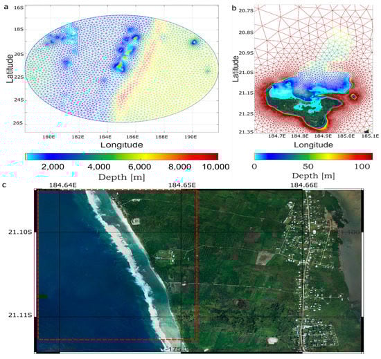 Tongatapu is in a shallow narrow strip adjacent to deep ocean water, especially to the immediate east where the Tonga Trench lies (i.e., ~200 km east of Nuku’alofa; see Figure 1b). Tongatapu is surrounded by a chain of islands (see Figure 1a,b) with swampy and extensive reefs and lagoons to the north, and narrow fringing coral reefs to the rest. To the eastern side lies the Tonga Trench (see the blue narrow strip east of Tonga in Figure 1b), with a depth up to 10,000 m below sea level, and the western side is a large plateau, around 3000 m depth below sea level, with Fiji lying to the northwest. Hence, Tongatapu is located in a shallow region influenced by strong currents with eddies trapping energy and dissipating long-wave phenomena and tides due to the abrupt changes in the depth between the eastern and western sides [57].