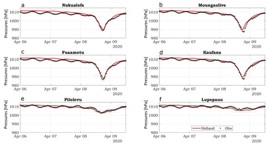 Comparison of the barometric pressure (hPa) evolution obtained from feeding the DHM with the BOM best track TC Harold data (red) versus observations (black) at the (a) Nuku’alofa tide gauge, and the AWSs located at (b) Mounga’olive (c) Fua’amotu airport, (d) Kaufana airport, (e) Pilolevu airport, and (f) Lupepau’u airport from 6 April 12h00 UTC to 9 April 12h00 UTC.
