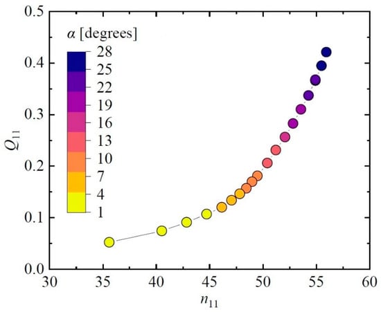 The runaway in prototype operation is the automatic increase and stabilization of the runner speed when the guide vanes refuse to adjust. Unlike this, the runaway in a model test requires a fixed guide vane opening angle. At the same time, the motor is adjusted and the runner speed is controlled to monitor the changes in torque. When the torque approaches 0 N·m, attention is paid to observing its variation. If the torque is positive, the speed is reduced. If the torque is negative, the speed is increased. When the torque of the runner fluctuates by no more than ±1 N·m around 0 N·m and remains stable for more than 3 s, the current parameters such as n, H, Q, and P are recorded, and n11 and Q11 are calculated based on Dlow. Figure 2 shows the runaway points measured in the model test; the guide vane opening angles of 1~28 degrees are considered. Table 1 lists the details of the points.