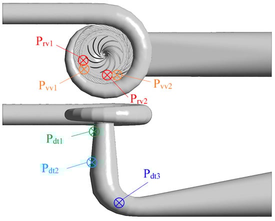 The measurement of pressure pulsation relies on dynamic pressure sensors and PCB signal amplifiers, both of which have an accuracy of 1%. A total of 7 measuring points are arranged on the model pump-turbine, including Pvv1 and Pvv2 points between the stay vane and the guide vane, Prv1 and Prv2 points between the guide vane and the runner, Pdt1 points adjacent to the outlet of the draft tube and the runner, Pdt2 points in the middle of the straight section of the draft tube, and Pdt3 points in the elbow section of the draft tube. The specific locations of these monitoring points are shown in Figure 3.