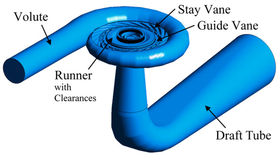 where Hd is 52.9 m and Qd is 0.62 m3/s in the model scale. Therefore, nq is about 34.6, which is a relatively low specific speed. The runner blade number is 9, the guide vane blade number is 22, and the stay vane blade number is also 22.